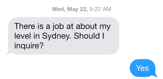 The details of the position were initially vague and, even if he did get it, were we really ready to uproot our lives and move the more than 10,000 miles from Boston to Sydney? Was I prepared to give up a great job only to find myself unemployed in one of the most expensive cities in the world so far away from everything I knew?